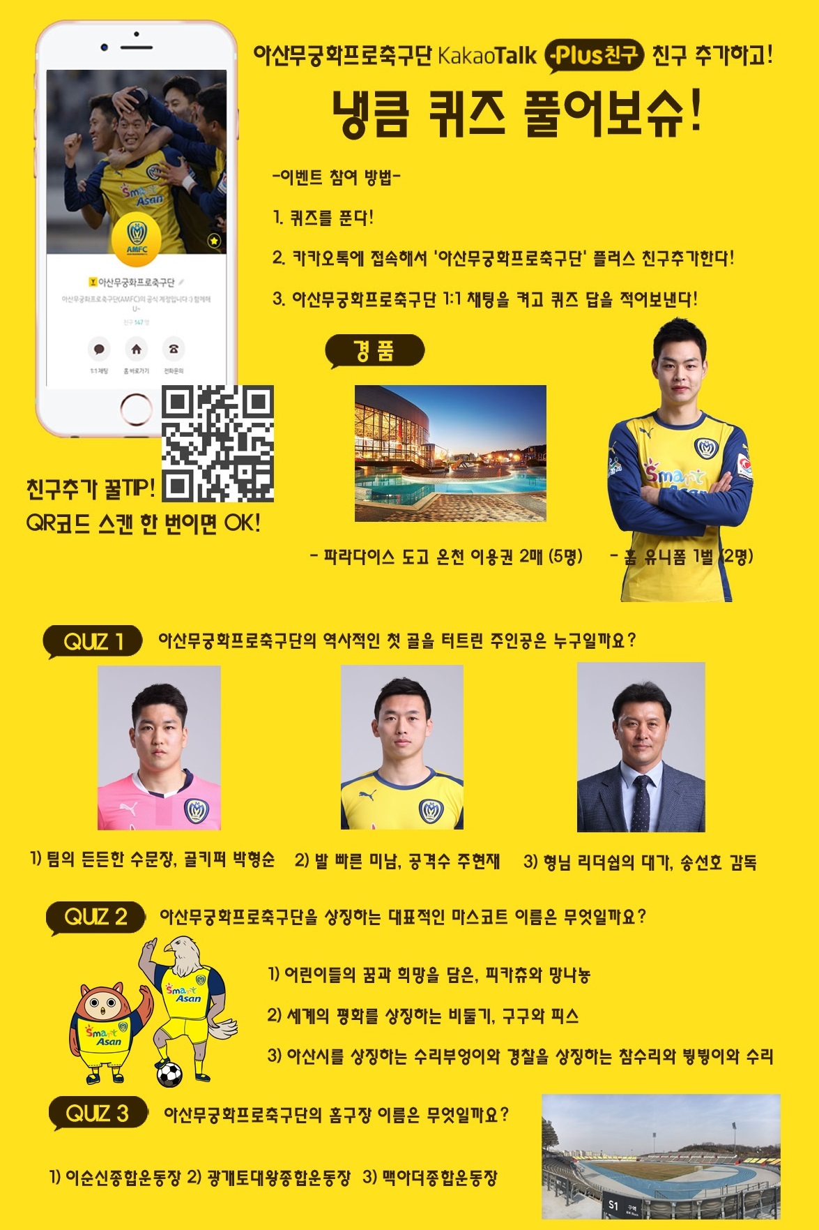 아산무궁화프로축구단 카카오톡 플러스 친구 추가하고! 퀴즈도 풀고! 경품 받아봐U!