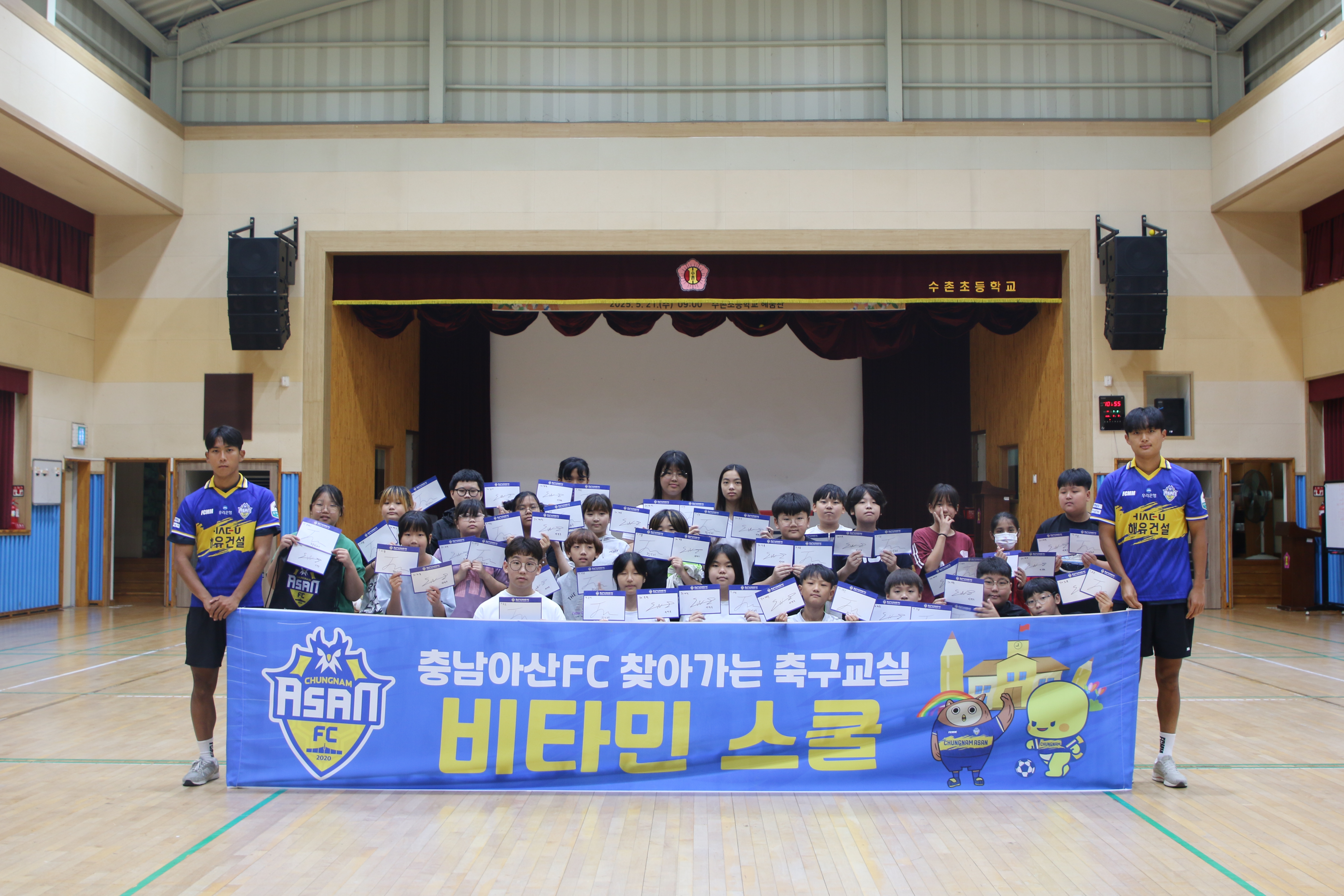 충남아산프로축구단(구단주 오세현, 대표이사 이준일, 이하 충남아산FC)은 지난 9일(화) 공주시에 위치한 수촌초등학교(이하 수촌초)와 태봉초등학교(이하 태봉초)를 찾아 2학기 첫 비타민 스쿨을 실시했다.