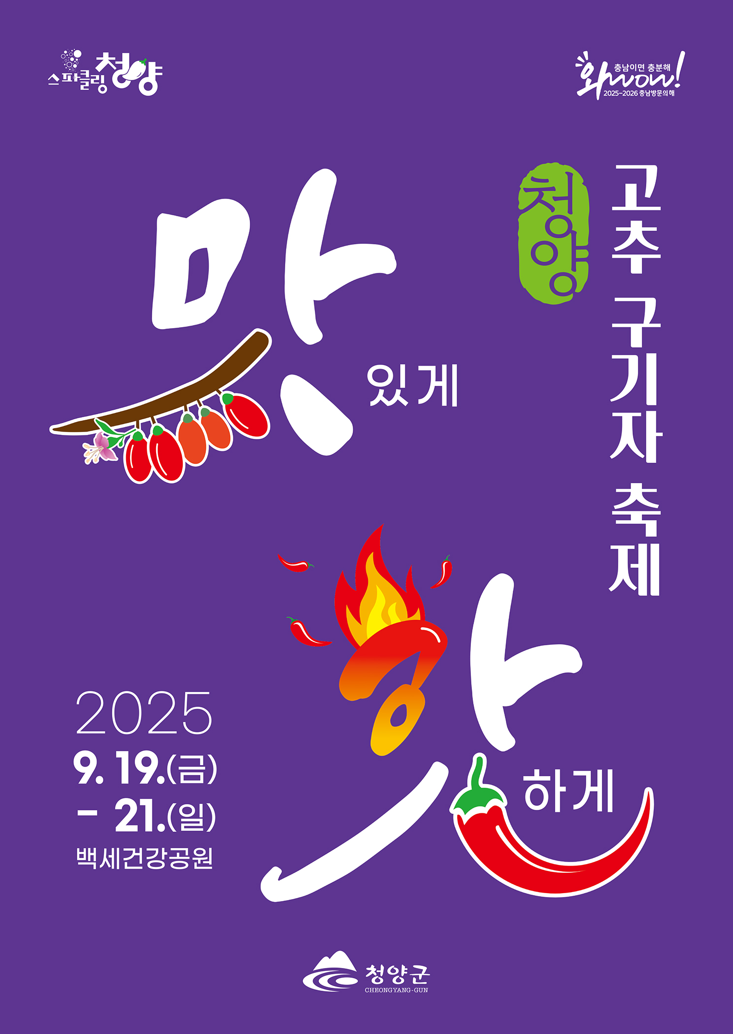 ‘2025 청양 고추·구기자 축제’는 오는 19일(금)부터 21일(일)까지 백세건강공원에서 개최되며 대형 겉절이 체험, 구기자 떡 모자이크 등 체험 프로그램과 함께 인기 트로트 가수 장윤정, 장민호의 축하 무대도 준비될 예정이다.