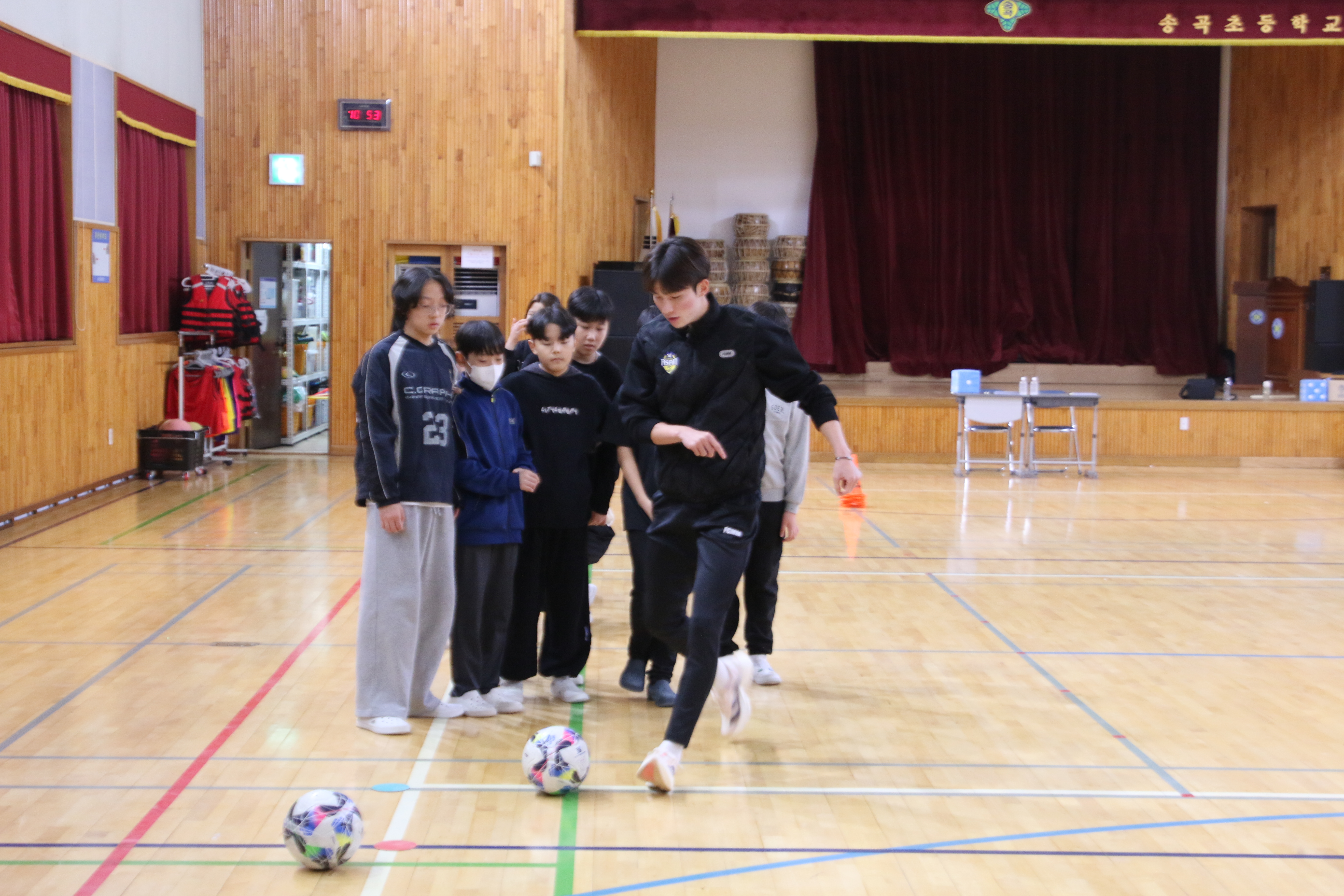 수업은 강당에서 진행됐으며 정마호·이유민 선수의 시범을 시작으로 기본기 훈련을 비롯해 색깔콘을 활용한 패스·드리블 게임, 팀별 미니 매치, 팬 사인회 등 다양한 프로그램으로 이어졌다.