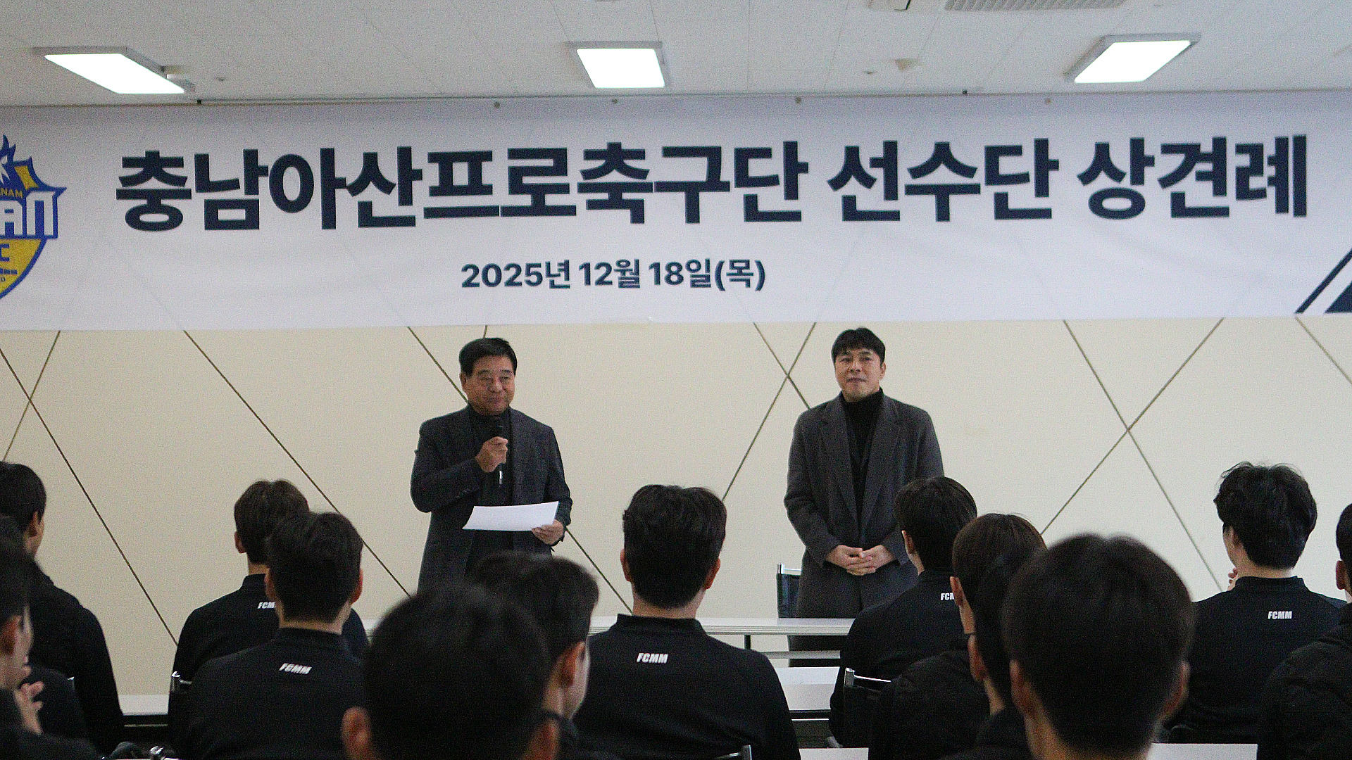 충남아산프로축구단(구단주 오세현, 대표이사 이준일, 이하 충남아산FC)은 오늘 18일(목) 이순신종합운동장 대회의실에서 2026시즌 선수단 상견례를 실시했다. 이날 행사에는 이준일 대표이사와 임관식 감독을 비롯해 선수단 및 코칭스태프 전원이 참석했다.