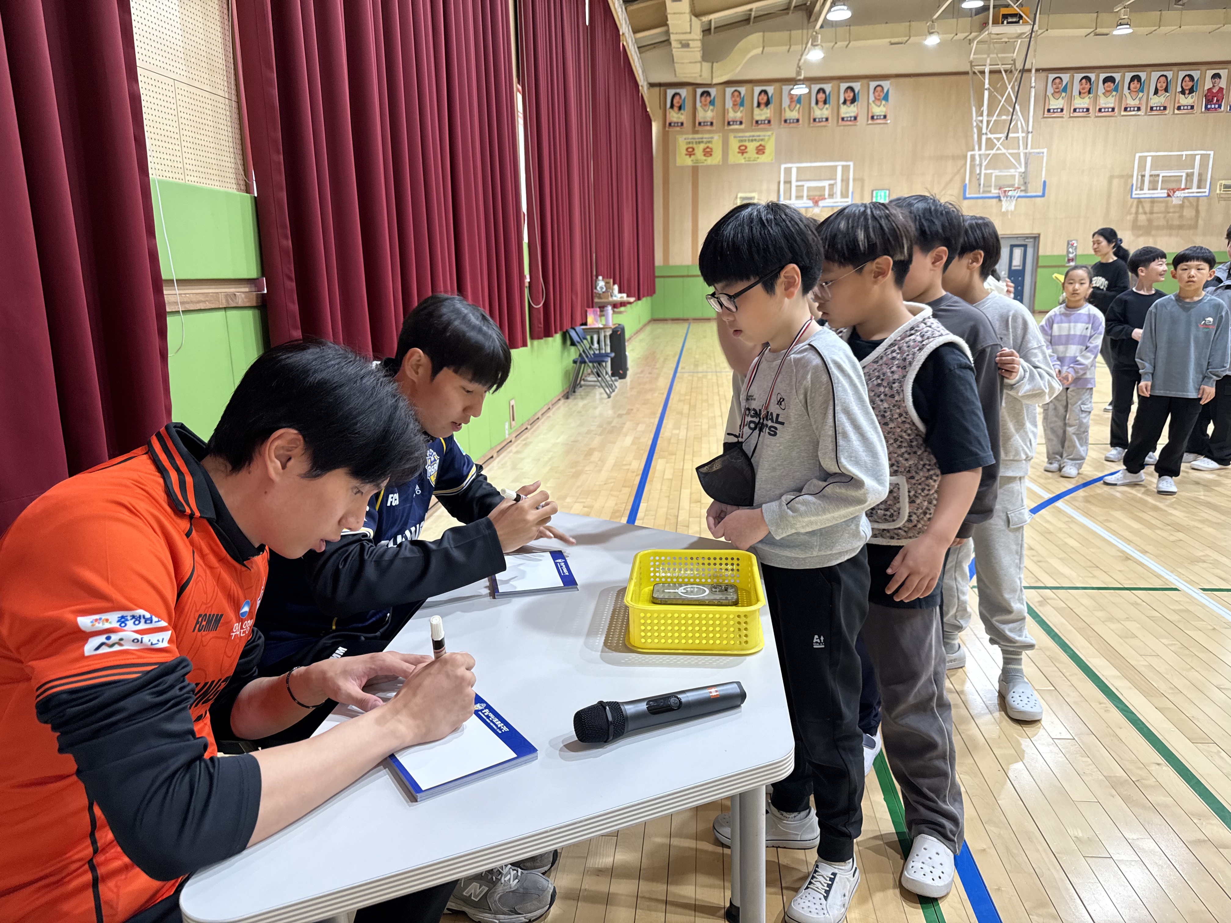 축구 교실 종료 후에는 퀴즈 타임 및 팬 사인회가 이어졌다. 학생들은 선수들과 축구를 주제로 이야기하며 충남아산FC 구단에 대해 알아가는 시간을 가졌다.