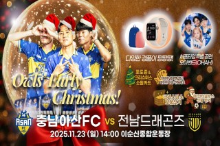 충남아산FC, 2025시즌 마지막 피날레 ‘미리 메리크리스마스’ 팬들에게 승리 선물! 충남아산FC가 홈 폐막전에서 팬들에게 승리를 선물한다.  충남아산프로축구단(이하 충남아산FC)은 오는 23일(일) 오후 2시 이순신종합운동장에서 전남드래곤즈를 상대로 ‘하나은행 K리그2 2025’ 39라운드 홈 폐막전을 치른다. &nbs