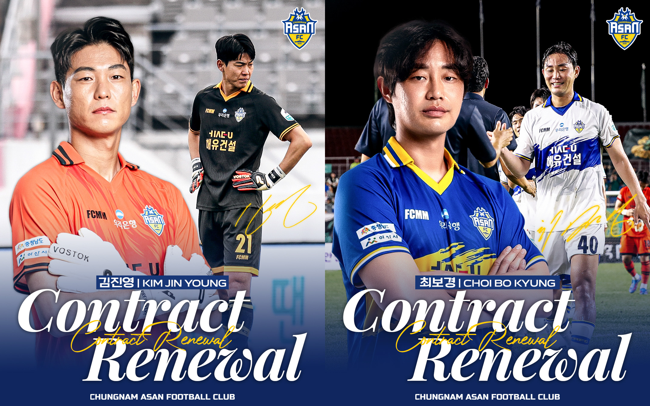 충남아산프로축구단(구단주 오세현, 대표이사 이준일, 이하 충남아산FC)이 베테랑 골키퍼 김진영, 수비수 최보경과 재계약하며 동행을 이어간다.